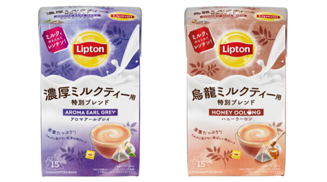 「リプトン 濃厚ミルクティー用 特別ブレンド」シリーズは、たっぷりミルクと風味豊かな茶葉が調和するカフェで味わうような濃厚な味わいを目指して開発したリプトンの新シリーズです。華やかなアールグレイの香りと味わいがミルクのコクと絶妙にマッチする「濃厚ミルクティー用 特別ブレンド アロマアールグレイ」と甘いはちみつの香りとウーロン茶の香ばしさを感じられる「烏龍ミルクティー用 特別ブレンド ハニーウーロン」の2種展開。アロマアールグレイには1.5倍、ハニーウーロンには1.4倍の茶葉がたっぷり*入っています。