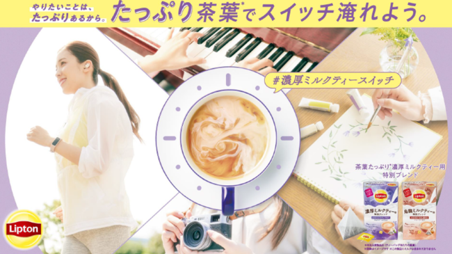 上司や部下、パートナー、友人、子どもを前にたくさんの顔や役割を持つ大人たちにとって、日常は仕事とプライベートという2面のオン・オフだけではありません。仕事や趣味、大切な人とのかけがえのない時間など、24時間がたくさんの”やらないといけないこと”や”やりたいこと”にあふれているのではないでしょうか。“紅茶を通して大切な人やものと向き合ってほしい”と願うリプトンは、忙しい毎日の中でも、”やりたいこと”をぜんぶ叶えようと生きる大人たちを後押しする「#濃厚ミルクティースイッチ」キャンペーンをスタート。仕事もプライベートも全力で頑張る姿を描いた「#濃厚ミルクティースイッチ」の動画を通して、リプトンは新たな切り替え時間を提案します。カフェで楽しむような、茶葉を煮だして作られる本格的な濃厚ミルクティーの味わいを実現した「リプトン 濃厚ミルクティー用特別ブレンド」シリーズで、ほっと一息つきつつ、次の”やりたいこと”に向けて前向きに気分をスイッチしてみては。