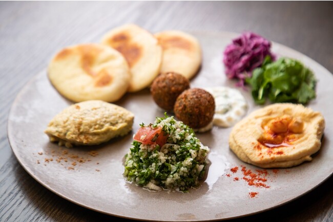 カタールのご当地前菜の盛り合わせプレート。カタールやレバノンで食べられているパセリが主役のサラダ “タブーリ” 、中東料理で最も市民権を得ている料理 “フムス”、焼きナスをペースト状にした “ババガヌーシュ”、ひよこ豆やスパイスを使用した元祖クロケットである “ファラフェル” 、ピタパンの盛り合わせ。