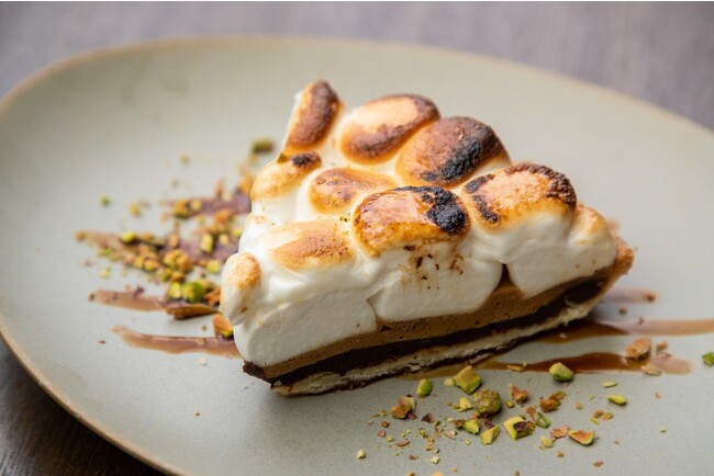 カルダモンで煮出したコーヒー、生チョコレート、マシュマロの三層と香ばしい生地とのコントラスト。世界中で愛されているスモア風チョコレートパイ。