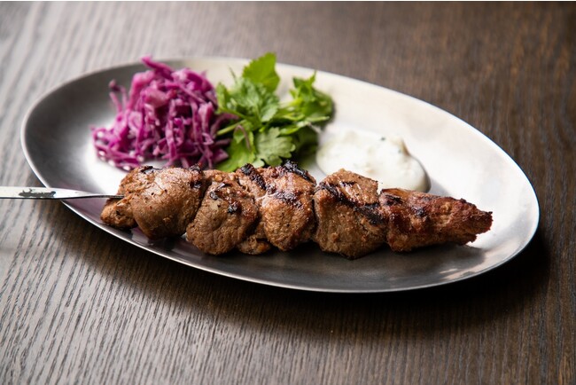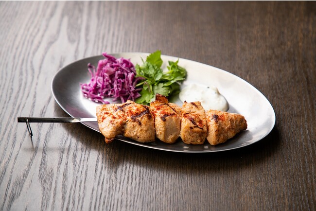 大山鶏の柔らかい肉質のむね肉をグリルしたシシケバブ。スパイスとソースをたっぷりつけて気分はアラビアンナ イト!
