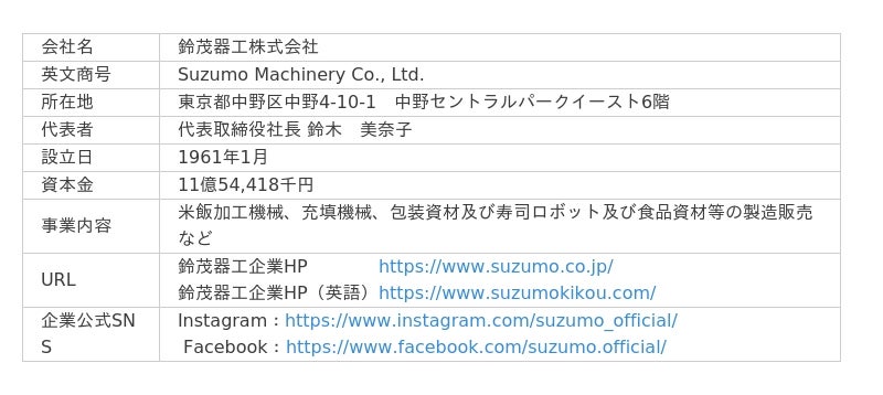 1981年に世界初の寿司ロボットを開発し、寿司の大衆化を実現したリーディングカンパニーです。米飯加工ロボットにおいて国内外で高いシェアを占め、お寿司、おにぎり、丼ものなど、世界中の様々な食のシーンで幅広く利用されています。近年では、ご飯盛り付けロボットシェアNo.1(出典:富士経済:「2022 年版 ワールドワイドロボット関連市場の現状と将来展望」 米飯盛付けロボット 販売金額・台数 2021 年実績)を獲得や、「Fuwarica(ふわりか) GST-MRA」が、「第25回外食産業貢献賞(日本食糧新聞社主催)」を受賞するなど、業界でも注目を集めております。『食の「おいしい」や「温かい」を世界の人々へ』を掲げ、細分化する食に関するニーズをいち早く捉えて市場にご提案し、常に新しいフードビジネスを開拓する企業として躍進しています。