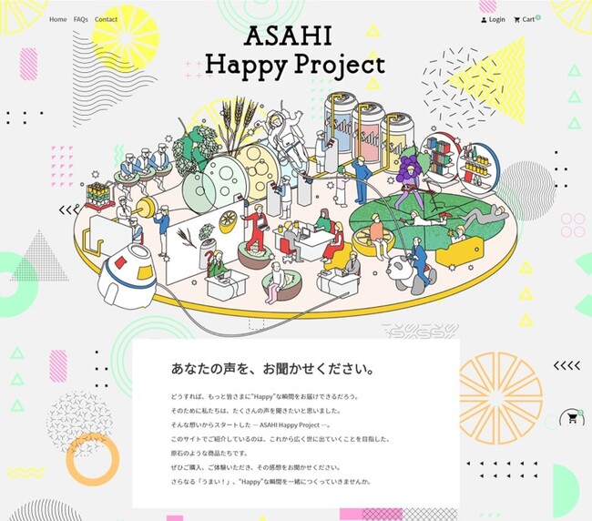 「ASAHI Happy Project」は新商品を数量限定でテスト販売し、お客さまがより魅力的に思える新商品の開発を目指すためのWEBサイトです。商品を購入したお客さまには、商品の味やパッケージに関するアンケートに答えていただき、声やニーズを把握することで、今後の商品開発に生かしていきます。第1 弾の商品として『YURU YURU ALE(ユルユルエ~ル) 』を発売します。当社が運営するSNS公式アカウントで告知し、取り組みに対する認知度拡大や購入促進に取り組みます。2023年以降はビール以外のカテゴリーの商品も含めて、新たな商品をテスト販売していく予定です。