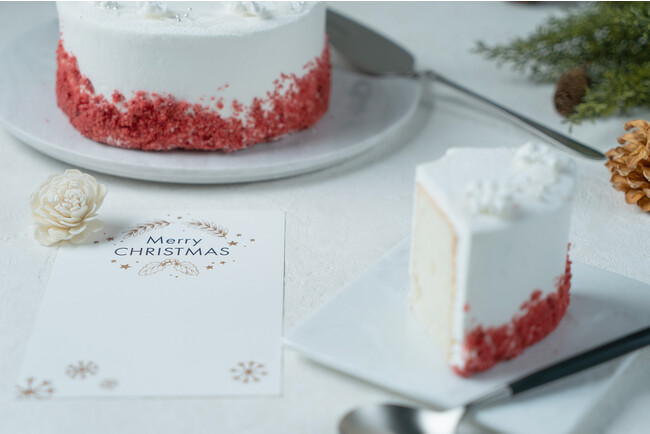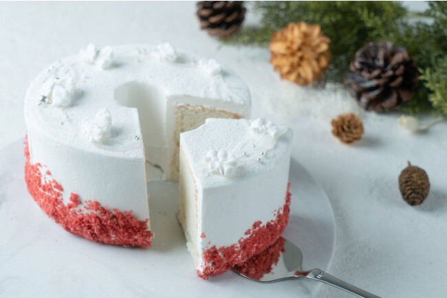 ふわふわ×しっとりの真っ白な生地と九州産生クリームでホワイトクリスマスをイメージ、側面にはレッドスポンジクラムでクリスマスカラーを演出しました。