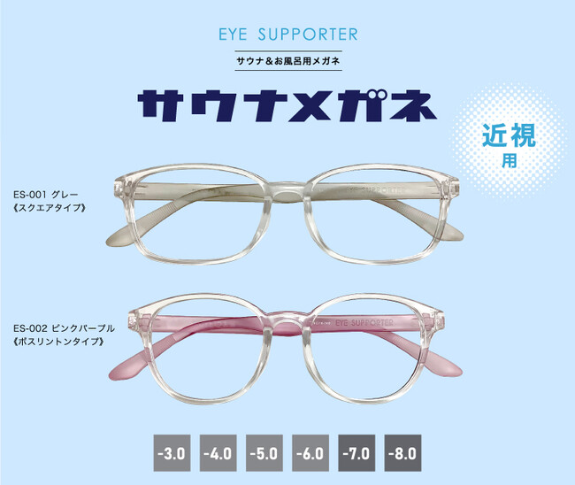 人気のボスリントン型とスクエア型のクリアフレームになって、サウナメガネとして新登場。