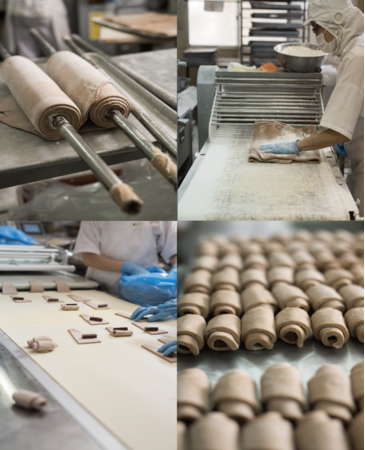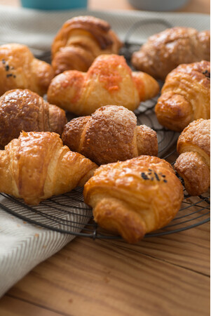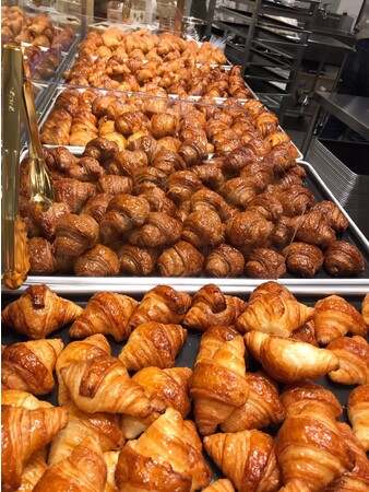 ミニヨンのクロワッサンは、食感に徹底的にこだわり、 機械では再現できない食感を出すために創業以来ずっと手作業で、 クロワッサン生地を折る“手折り製法”で生地を作っており、 “外はサクッと、中はモチッと“2つの食感が味わえます。
