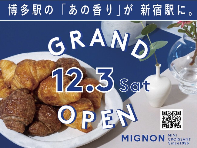 株式会社生産者直売のれん会(本社台東区 代表取締役黒川健太)は、「焼き立てミニクロワッサン専門店」MIGNON(ミニヨン)を新宿駅通路内にある小田急エース南館に2022年12月3日(土)出店いたします。ミニヨンは、九州博多で26年間愛され続けている「焼きたてミニクロワッサン専門店」です。日本初のミニクロワッサン専門店として、1996年の創業以来、皆様に愛される店舗、商品であり続けることを目指し、全国で11店舗を運営しております。ミニヨンの旗艦店であるJR博多店は、26年経過した今でも、毎日およそ2000人が来店し、年間で約1000万個のミニクロワッサンを販売しているオープンから現在まで行列が途絶えない人気店です。