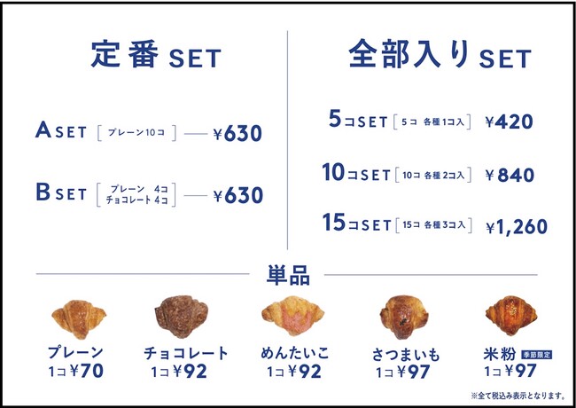 商品メニューとしては、「プレーン」の他、ミニヨンの代表商品となる「チョコレート」や季節限定商品である「米粉のクロワッサン」、九州の名物、明太子のペーストを使用した「めんたいこのクロワッサン」などを用意しています。