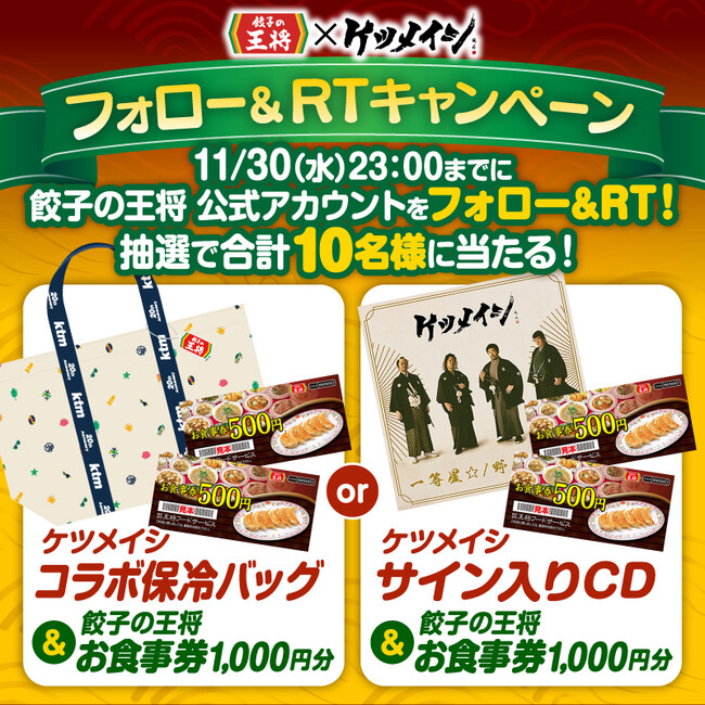 ケツメイシコラボ保冷バッグやケツメイシサイン入りCD、餃子の王将お食事券が当たる「Twitterフォロー&リツイートキャンペーン」を実施いたします。
