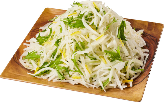 冬が旬の大根とゆず、水菜を特製のゆずオリーブオイルソースで和えました。冬を感じるシャキシャキとした大根、みずみずしい水菜、ゆずの香りが一体となり、肉料理の前菜としてピッタリなサラダです。隠し味にホワイトペッパーを加えることで、クセになる味わいが楽しめます。