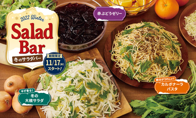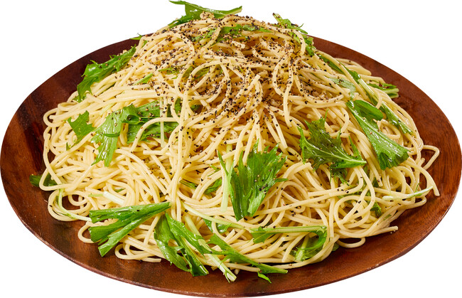 サラダバーのパスタにビッグボーイ初のカルボナーラパスタが登場します。冬が旬の、鉄分を豊富に含みシャキシャキとした食感が特長の水菜を加え、仕上げに粗挽きブラックペッパーをかけました。ブラックペッパーの香りとピリッとした辛みが食欲をそそる、前菜としてもおすすめのパスタです。