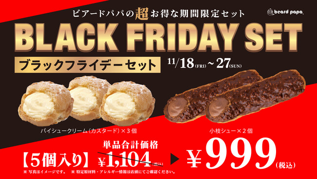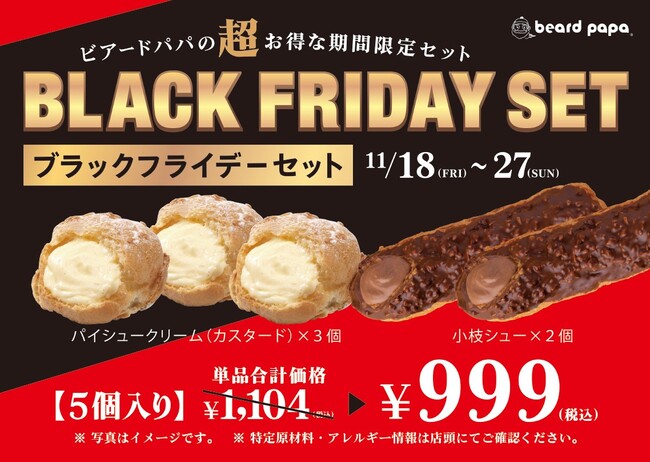 株式会社麦の穂(本社:大阪府大阪市北区、代表取締役:杉内 健吉)は、シュークリーム専門店ビアードパパにて2022年11月18日(金)~11月27日(日)の10日間、特別価格の“ブラックフライデーセット”を販売いたします。ブラックフライデーセットは、ビアードパパの看板商品“パイシュークリーム(カスタード)”3個と、森永製菓株式会社(本社:東京都港区、代表取締役社長:太田 栄二郎)の “小枝<ミルク>”とのコラボで話題のシュークリーム“小枝シュー”2個を組み合わせた、人気商品計5個を999円(税込)で販売する“超”お得な期間限定のセットとなっております。毎日お店で作るビアードパパこだわりの「できたて、作りたて」のシュークリームを、この機会にぜひお楽しみください。