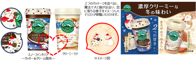 さらに、今年のパッケージは魔法使いのような雪だるまと、クッキー&クリームを連想させる柄の犬が加わり、より幻想的なデザインにリニューアルしました。この冬限定で、「マウントレーニア カフェラッテ クリーミーラテ」とのパッケージ連動も実施いたします。連動パッケージを並べると、雪だるまの魔法で犬と猫が出会い、恋に落ちるロマンティックな様子をイメージしたイラストが御覧頂けます。