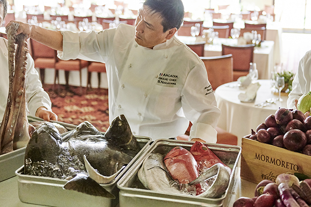 地元九州をはじめ北海道より生産者直送の新鮮な食材は、アルカディアのグランシェフが自ら市場や生産者の元へ出向きやり取りを重ね、納得できる品質を厳選しました。さらにお食事の時間をお楽しみいただけるように、専属のソムリエセレクトワインやウイスキー、カクテルなど様々なお酒をご用意しております。