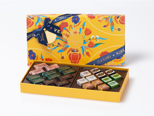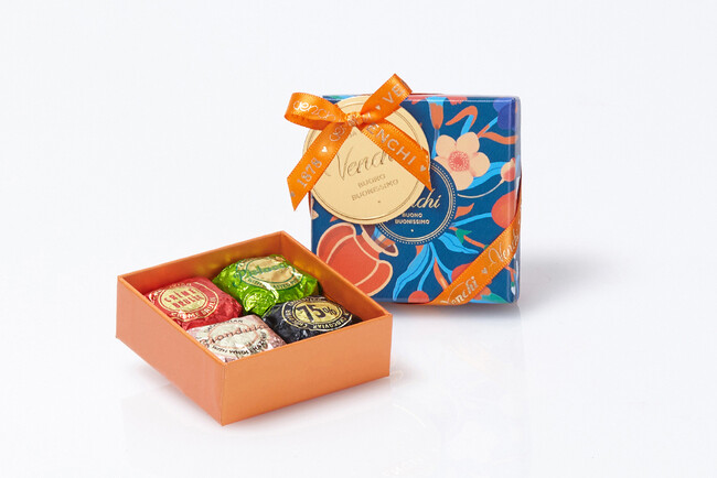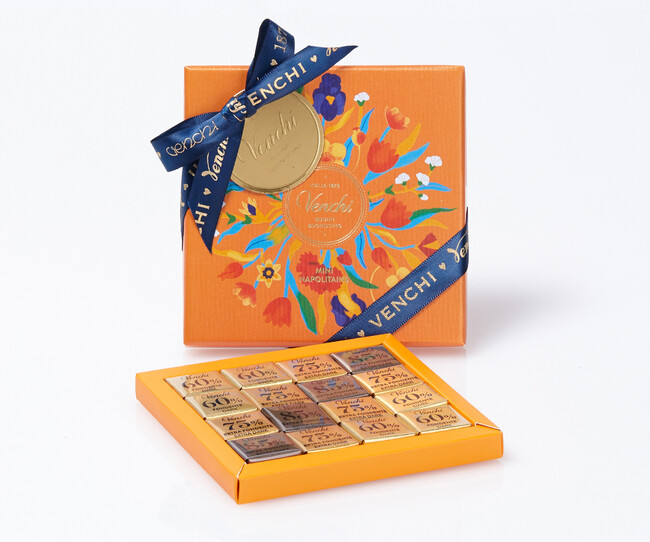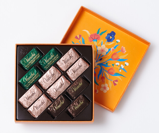 ヴェンキのアイコニックなチョコレート「チョコビア」4種類を詰め合わせたギフトセット。色とりどりの花が咲き誇る手のひらサイズのボックスにオレンジのリボンをかけてお届けします。