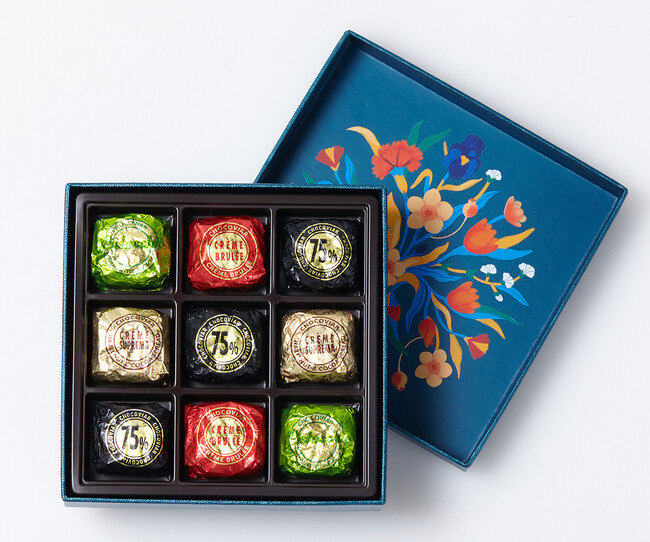 色とりどりの花々が力強く咲き誇るブルーのハンパー。9種類15個の多彩なレシピのチョコレートをバランスよく詰め合わせました。