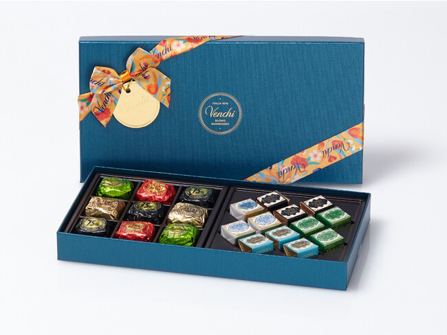 優美なネイビーのギフトボックスにヴェンキのアイコン的なチョコレート、チョコビアとクレミノ8種類21個を詰め合わせました。