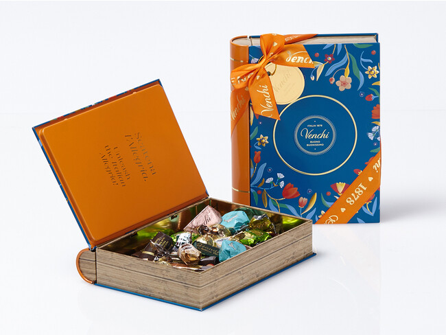 バロックデザインのマキシブック缶。色とりどりの花々が咲き誇るデザインは生命の力強さを感じさせます。ヴェンキこだわりのコレクションを堪能できる10種類22個をバランスよくアソートしました。