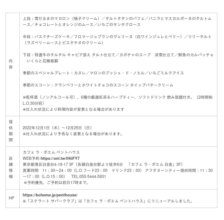 国内、L.A.に46舗のレストランを展開している株式会社グローバルダイニング(本社:東京都港区南青山7丁目/代表取締役社長:長谷川耕造)は、 白金台「CAFE La Bohème PENTHOUSE(カフェ ラ・ボエム ペントハウス)」にて、「クリスマス アフタヌーンティーセット」を、2022年12月12日(月)~25日(日)の期間限定で提供いたします。