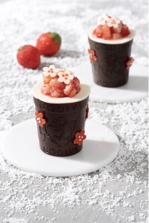 新年のお祝いにぴったりな、紅白のデコレーションをあしらったニューイヤー期間限定のクープショコラです。苺を贅沢に使用し、ダークチョコレートカップの中には、スポンジ、ホイップクリーム、角切りにした苺が層になっています。イートインでは、ストロベリーアイスクリームを添えて提供いたします。