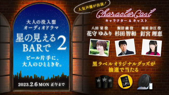 コンビニエンスストア限定で販売されるサッポロ生ビール黒ラベルのキャンペーンデザイン缶を購入し、専用応募シールの二次元コードから特設サイトにアクセス、 CLUB黒ラベルに会員登録いただくことで参加可能となります。サイト内でオリジナルオーディオドラマを視聴するごとにもらえるポイントを使いキャンペーン賞品に応募でき、抽選で「サッポロ生ビール黒ラベル350ml6缶パック」を1,000名様、「『バー・スターネオン』オリジナルタンブラー3個セット」を300名様、「ロボット掃除機(Eufy RoboVac G10 Hybrid) & 出演声優サイン入り台本」を10名様にプレゼント。