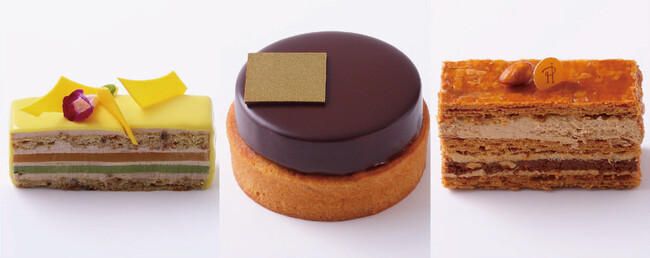 ピエール・エルメ・パリのエスプリ溢れる優美なスイーツは芸術作品そのもの。その中でも特に女性の人気のバラとライチとフランボワーズの奏でるハーモニーが圧倒的な存在感を誇る代表作「イスパハン」、何層にも重ねられたカラメリゼしたサクサクのパイ生地に、プラリネフィユテ、プラリネ風味ムスリーヌが存在感を放つ「ドゥ ミルフィーユ」(写真右)をはじめ、「タルト アンフィニマン ショコラ」(写真中央)「プレジール シュクレ」「アンフィニマン ジャスマン」などの人気の定番のほか、マロン・パッションフルーツ・抹茶のバランスが絶妙な「サラ」(写真左)など話題のスイーツも登場。そのほかバリエーション豊かな「マカロン」や「ボンボンショコラ」など、ピエール・エルメ・パリのスイーツの数々を存分にご堪能いただけます。