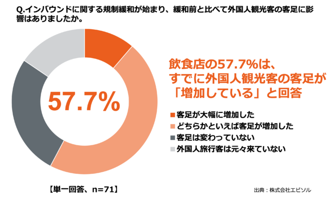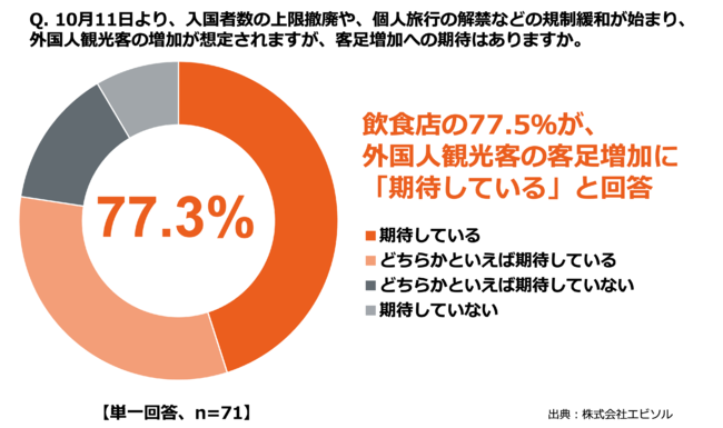 飲食店の8割近く(77.5%)が、インバウンド規制緩和を受け、外国人観光客の客足増加に「期待している」と回答。全体の6割近く(57.7%)は、すでに外国人観光客の客足が「増加している」という結果に