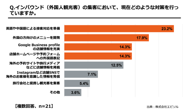 さらに、解決のための施策を打っている飲食店に対して、現在どのような対策を行っているか聞くと、上位から「英語や中国語による接客対応を準備」(23.2%)、「外国の方向けのメニューを開発」(17.1%)、「Google Business profile(旧Google my Business)の店舗情報を充実」(14.3%)、「店舗ホームページや予約フォームへの外国語表記」(14.3%)がランクインしました。