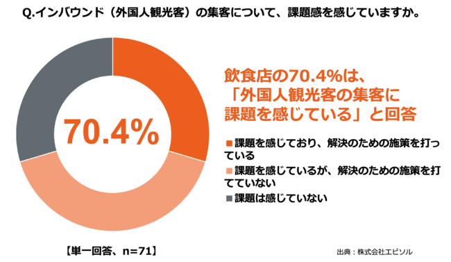飲食店の7割以上(70.4%)は、「外国人観光客の集客に課題を感じている」と回答。そのうち半数以上(58.0%)は対策が打てていないことが明らかに
