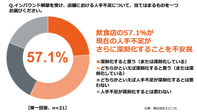 インバウンド需要増加の一方で、飲食店の6割近く(57.1%)が現在の「人手不足がさらに深刻化する」ことを不安視しているという結果に
