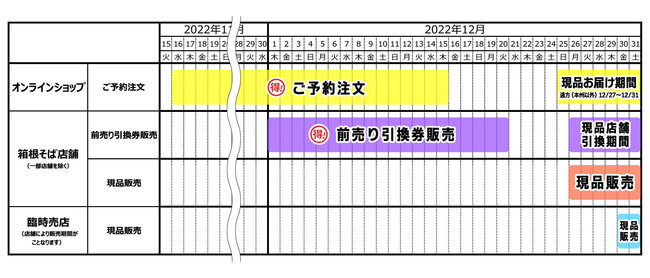 あわせて、箱根そば各店で商品の引き換えを希望されるお客さまにつきましては、12月1日(木)から20日(火)まで店頭にて「前売り引換券」を販売いたします。券売機で食券をご購入いただき、当日中に受取店舗・日時等を指定した「前売り引換券」とお引き換えください。