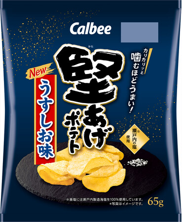 ●こだわりの「瀬戸内の塩」を使用。塩の粒度を調整することで、「堅あげポテト」の生地にマッチし、最後まで旨味が続くおいしさに仕上げました。
