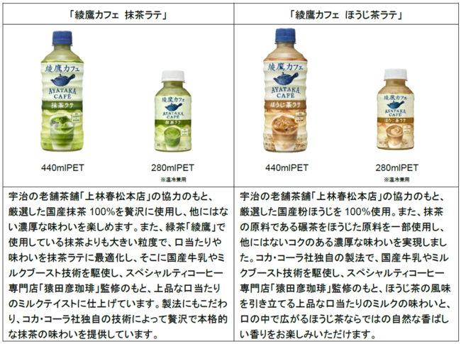 コカ・コーラシステムの緑茶ブランド「綾鷹」から誕生し、本格的な味わいで大変好評いただいている「綾鷹カフェ」シリーズは、シリーズ初となるホットの「綾鷹カフェ 抹茶ラテ」「綾鷹カフェ ほうじ茶ラテ」を全国で発売しています※1。