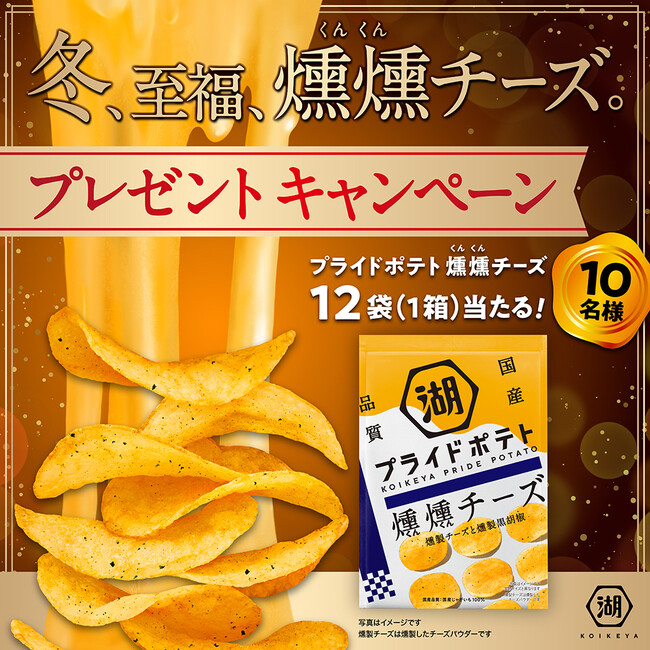 燻燻薫る、秋冬の新定番「湖池屋プライドポテト 燻燻チーズ」を片手に、冬の至福のひとときを贅沢に味わっていただきたいとの思いから、「湖池屋プライドポテト 燻燻チーズ」(1箱/12袋入)を抽選で10名様にプレゼントするキャンペーンを実施します。