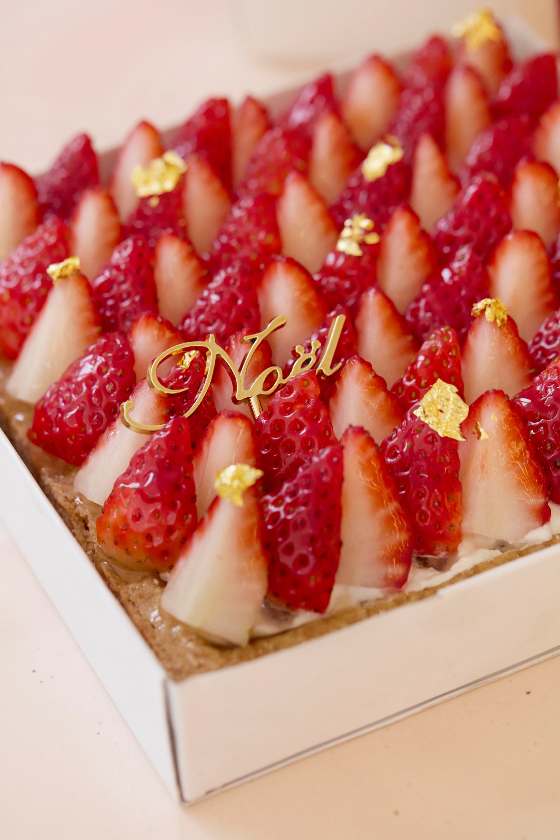 クリスマスのNOELピックがきらりと光り、箱を開けた瞬間に心まで華やぐ特別な仕上がり。 香ばしいタルト生地が、いちごの甘酸っぱさをやさしく引き立てます。 4名ならしっかり満足、9名ならパーティーで一口ずつ楽しめるサイズ感で、ホリデーギフトにも、大切な人とのクリスマスにも寄り添います。