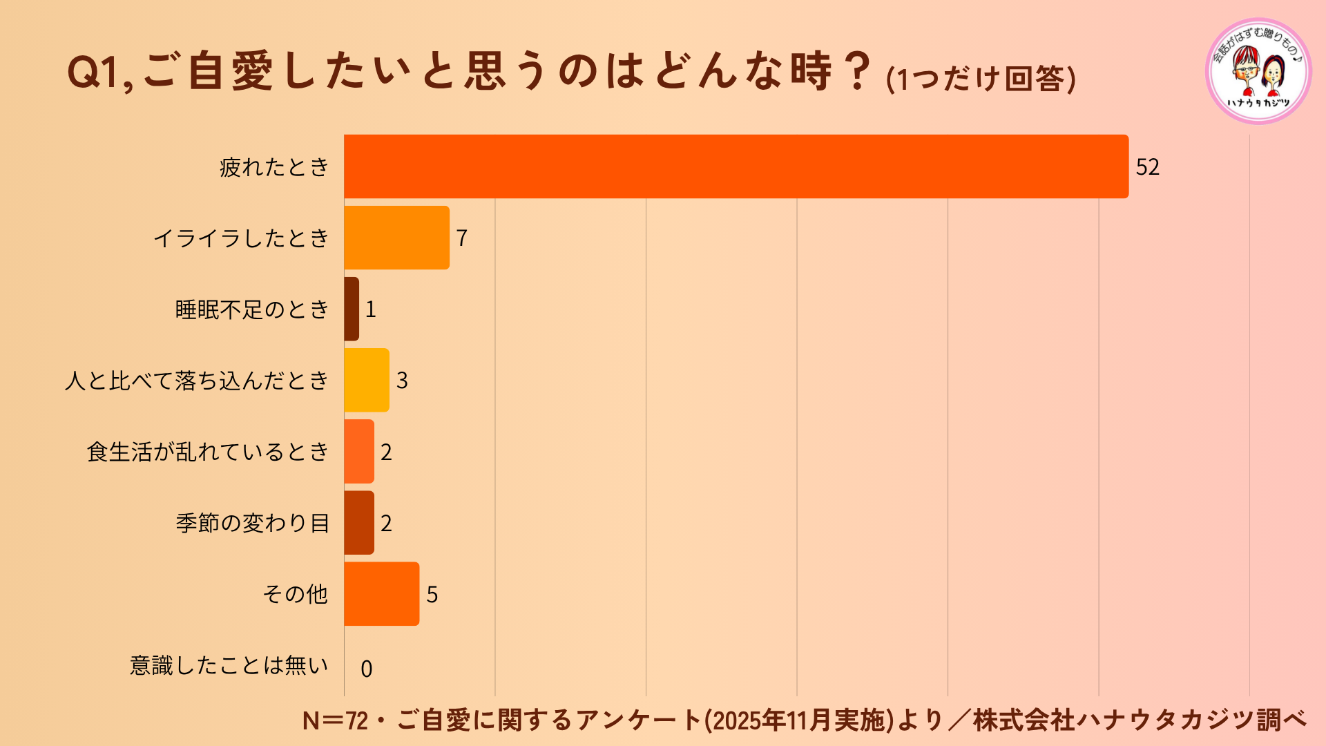 「ご自愛したいと思うのはどんな時?」という質問に対して、疲れたときが72%と大半を占めました。
