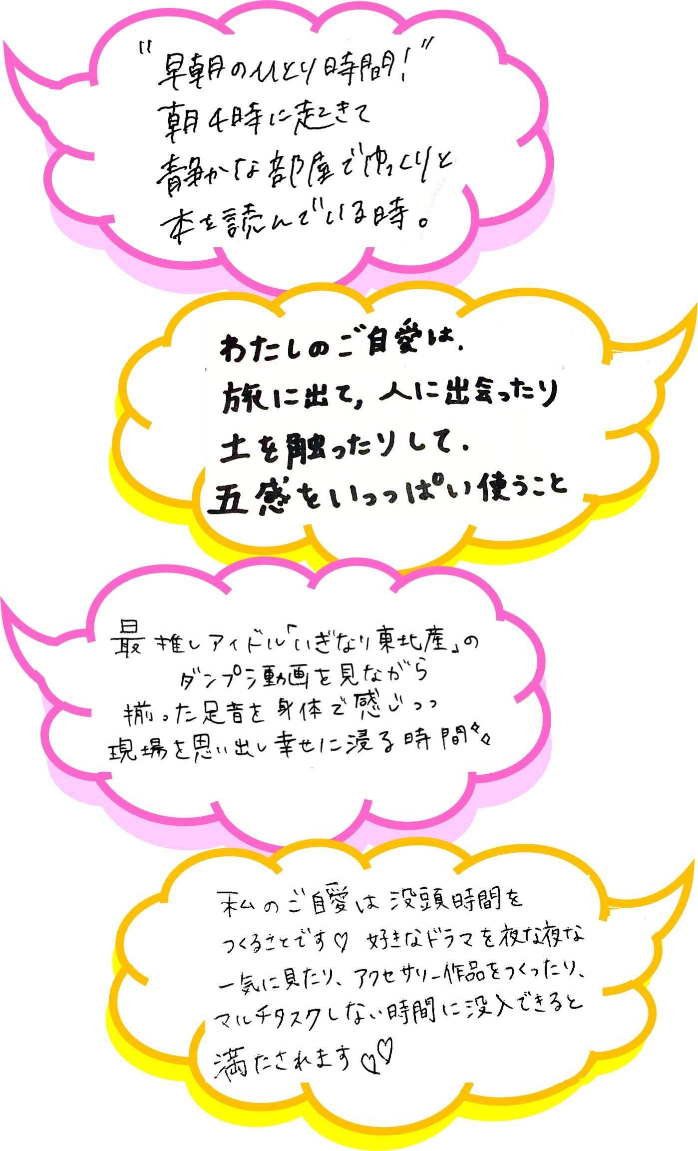 選択式のアンケートのほか、より具体的なご自愛を知るべく 記述式の聞き取りも行いました。 手書きすることで、より内省を深め 自分に向き合ったその人なりのご自愛が見えてきました。
