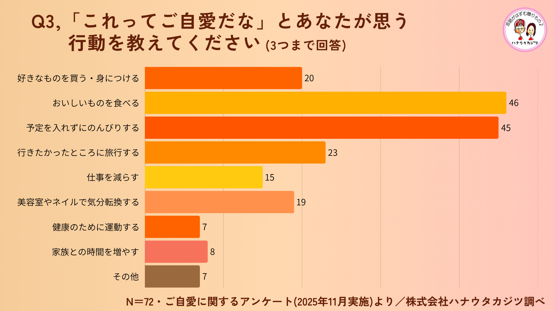 多くの人が求めている「ご自愛」の形は、当社が行ったアンケートでは「おいしいものを食べること46票)」「予定を入れずにのんびりすること(45票)」とが、もっとも“自分を大切にする行動(ご自愛)”として支持されました。