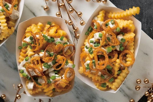 内容:クリンクルカットのフライの上に、フライドオニオン、ねぎ、黒トリュフ入り