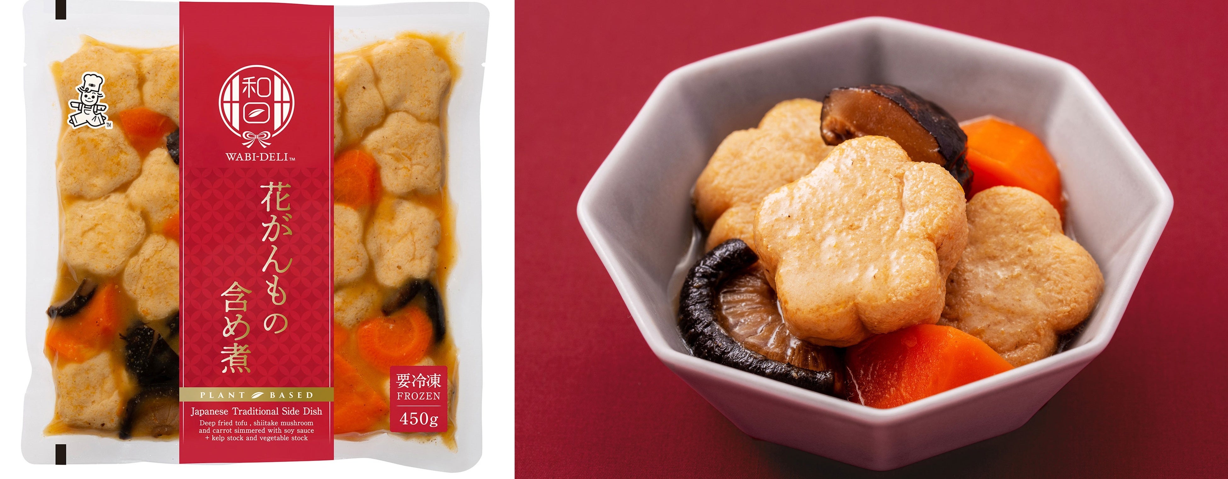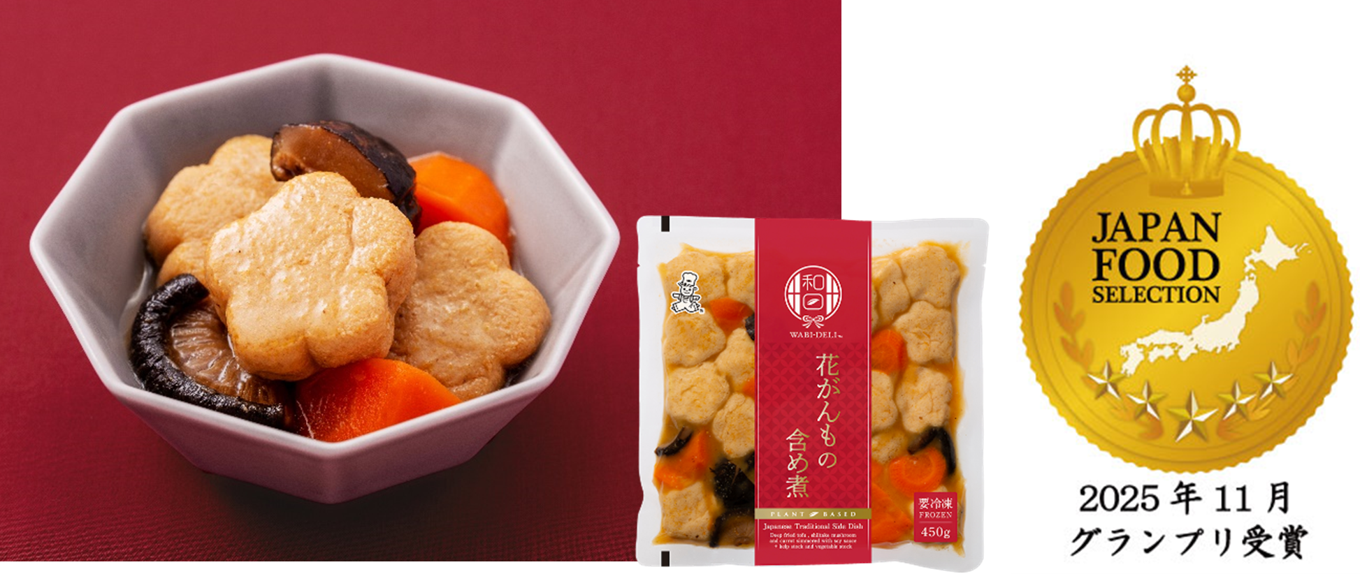 この度グランプリを受賞した『WABI‐DELI 花がんもの含め煮』は、精進料理が息づく福井県で古くより親しまれてきた伝統的な食材「がんもどき」の中でも、見た目にもこだわった花形のがんもどきを使用した和惣菜です。花がんもに、しいたけとにんじんを合わせ、具材に染み込んだだしが口いっぱいに広がる深い味わいが特長です。今回の受賞では、「素材の味を活かした味付けが健康的」「花がんもの形が珍しく、目を引く」「冷凍保存なのでストックとしても非常に便利」「ブランドの背景や深い思いが心に響く」などのコメントをいただきました。
