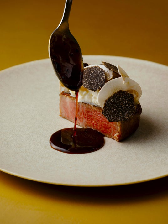 北山杉で焼いた黒毛和牛フィレ肉 ブッラータチーズ トリュフソース