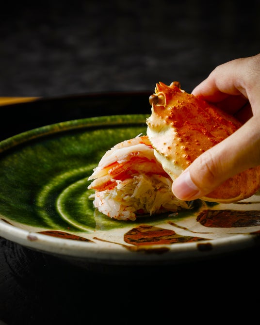 京都府丹後沖や兵庫県山陰沖、越前、金沢などの名漁港で水揚げされたタグ付き活ずわい蟹の中から、その日最良の一杯を厳選。鮮度抜群の1kg級の蟹を使用し、懐石料理として多彩な調理法でご堪能いただけます。