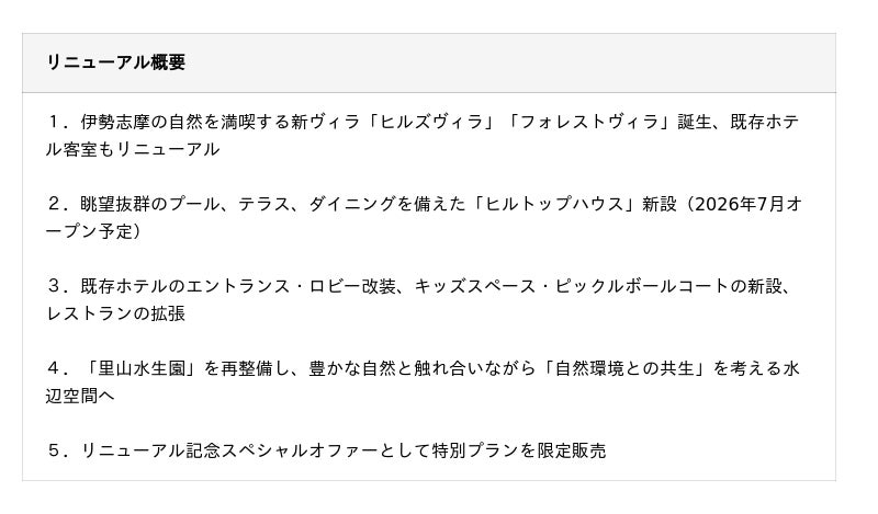 1.伊勢志摩の自然を満喫する新ヴィラ「ヒルズヴィラ」「フォレストヴィラ」誕生、既存ホテル客室もリニューアル