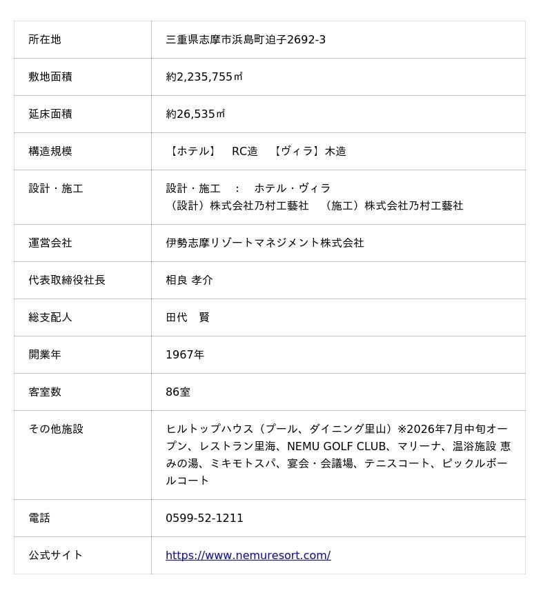 三井不動産株式会社(本社:東京都中央区、代表取締役社長 植田 俊)と三井不動産グループの伊勢志摩リゾートマネジメント株式会社(本社:三重県志摩市、代表取締役社長 相良 孝介)は、現在、「NEMU RESORT(所在:三重県志摩市、客室数:68室)」の大規模改修工事を推進しておりますが、このたび2026年4月18日(土)にリニューアルオープンすることを決定いたしました。予約の受付は、2025年11月17日(月)より開始いたします。