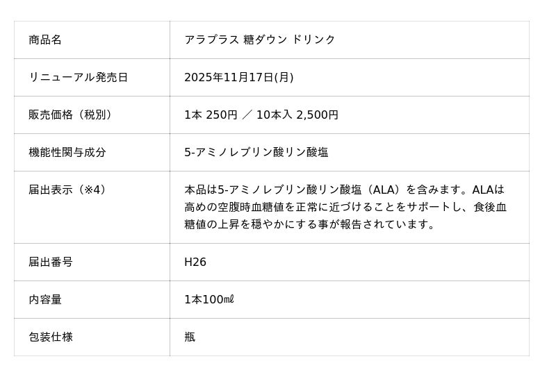 SBIホールディングス株式会社の連結子会社で5-アミノレブリン酸リン酸塩(5-ALA(※2))を利用した健康食品、化粧品の製造・販売等を行っているSBIアラプロモ株式会社(本社:東京都港区、代表取締役:竹崎 泰史、以下「SBIアラプロモ」)は、2022年の発売以降ご好評いただいている機能性表示食品「アラプラス 糖ダウン ドリンク」を、アラプラス 糖ダウンブランド10周年を記念して、パッケージの装いを新たにリニューアル新発売いたします。2025年11月17日より順次、コンビニエンスストア、スーパーマーケットやドラッグストア等の販売代理店やSBIアラプロモ公式オンラインショップ「アラ・オンライン」(https://www.5-ala.jp/)を通じて販売いたします。