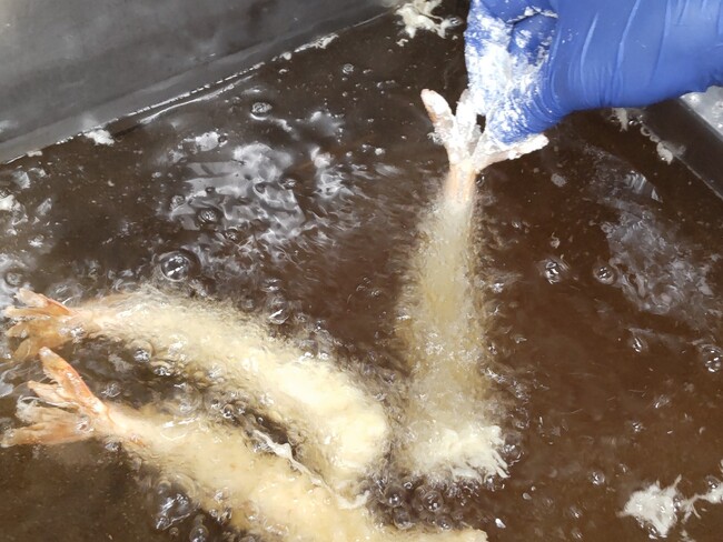 SRSグループの購買力を活かした鮮度よく、安全で、大きく食べ応えのある海老を当日に店舗で丁寧に粉打ちして衣をつけて揚げます。
