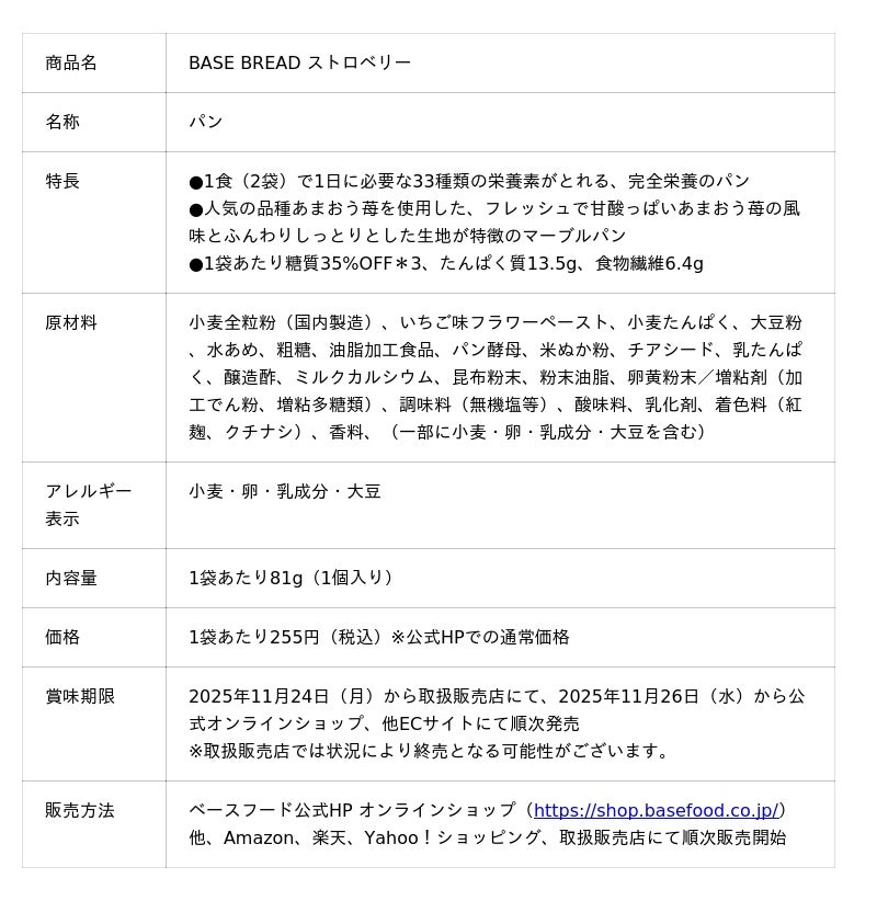 完全栄養の主食※1を開発・販売するベースフード株式会社(本社:東京都目黒区、代表取締役:橋本舜、https://basefood.co.jp)は、1食に必要な33種類の栄養素がすべてとれる全粒粉ベースの完全栄養のパン※2「BASE BREAD(ベースブレッド)」シリーズから、「BASE BREAD ストロベリー」を2025年11月24日(月)より取扱販売店にて、2025年11月26日(水)より公式オンラインショップ(https://shop.basefood.co.jp/)、他ECサイトにて順次販売開始します。
