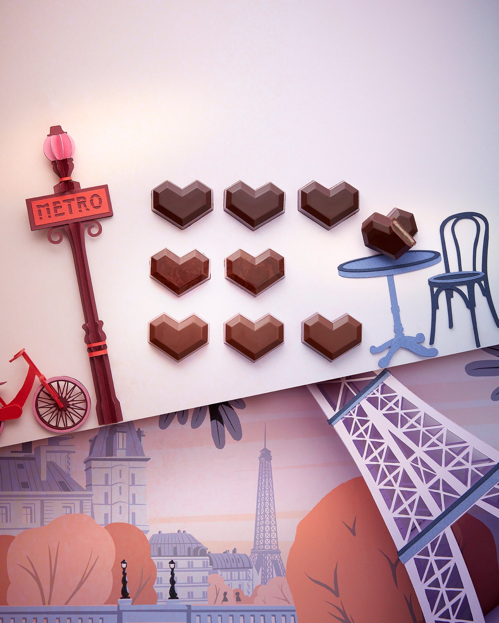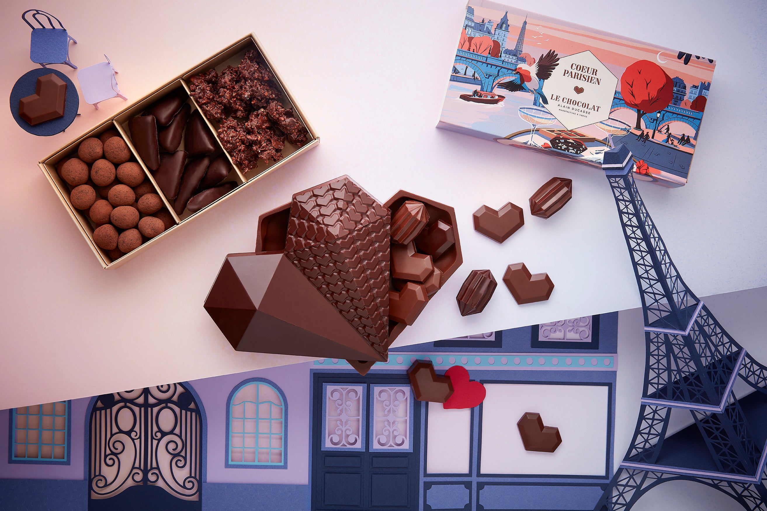 2026年のバレンタインコレクションのテーマは、「パリのときめき」。愛と芸術、美食とロマンが息づく“光の都”パリ。その街が放つエスプリをときめく心に重ね、芸術的な幾何学デザインで表現されたハートをモチーフに、ショコラティエが心を込めて手づくりするショコラや限定アソートをご用意いたします。