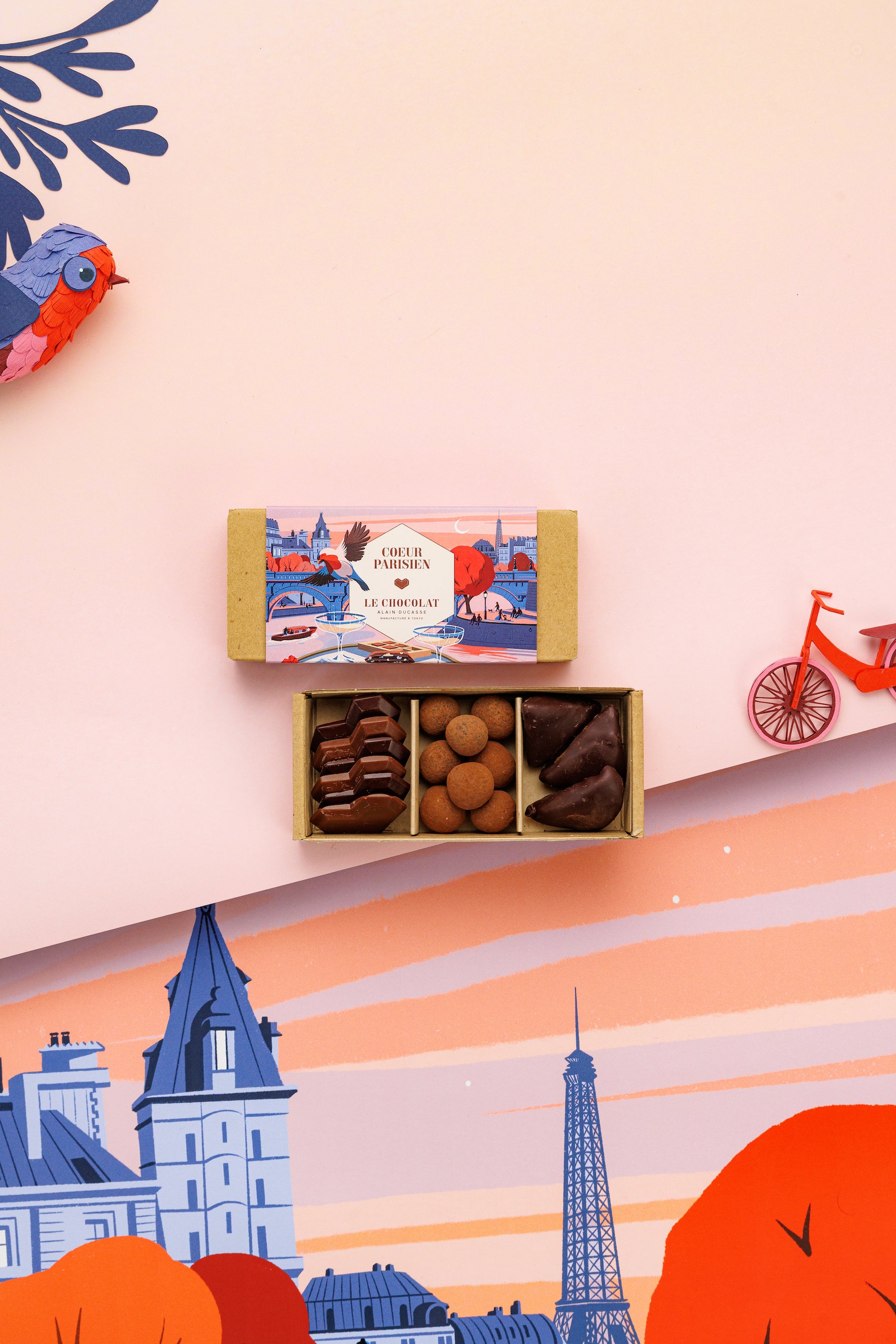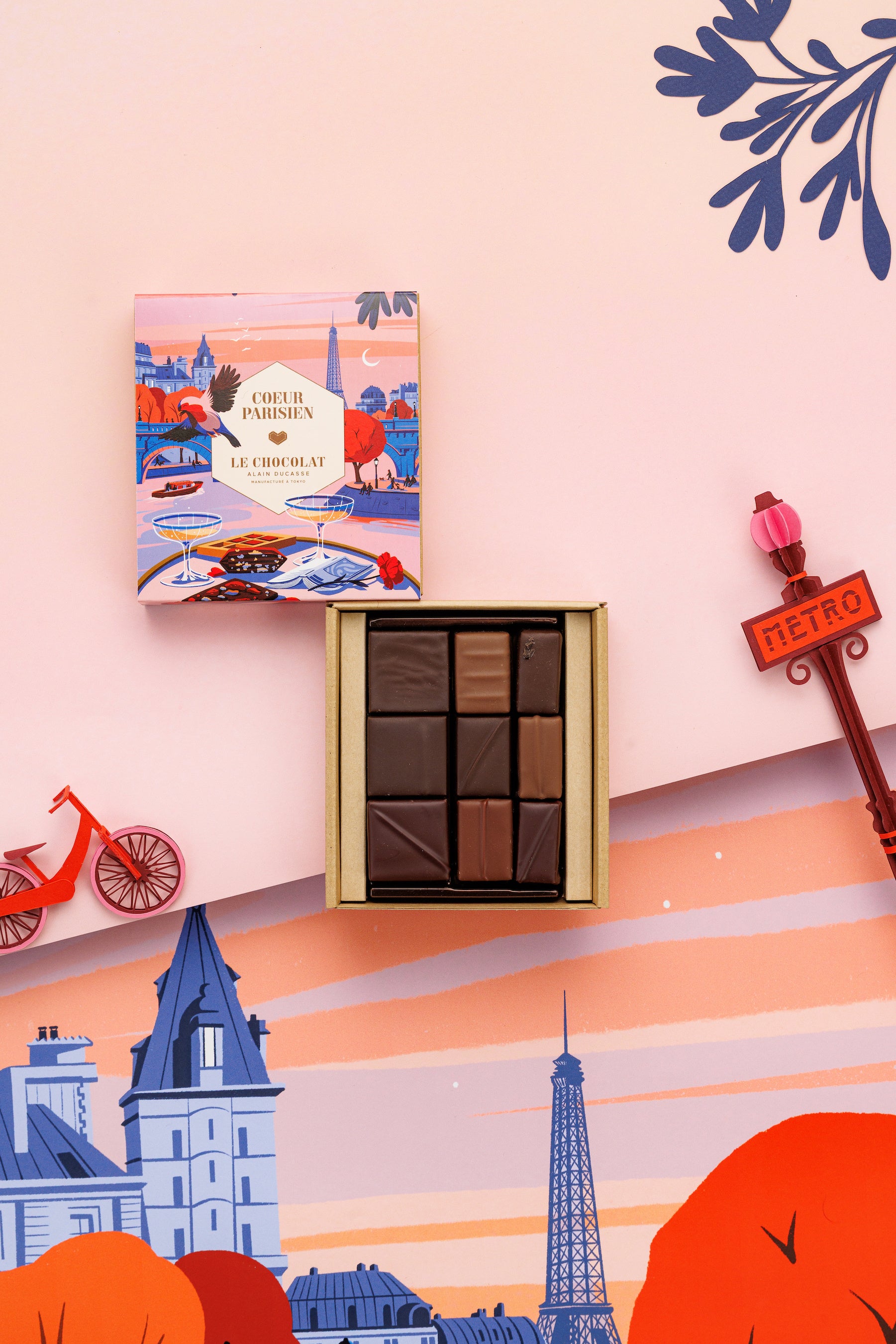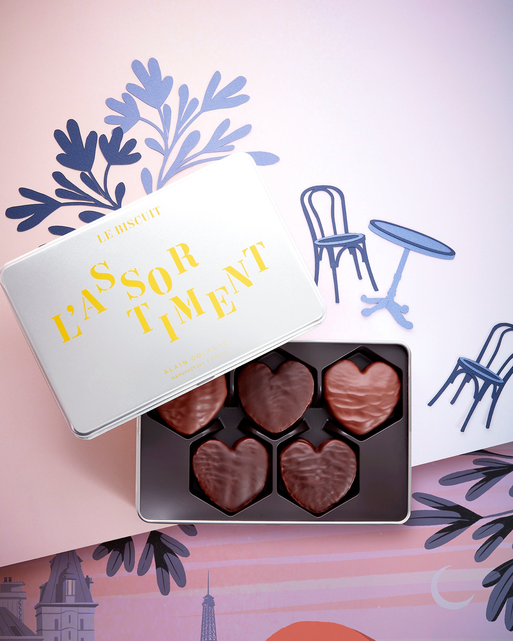 パッケージは、フランスの人気イラストレーター Paul Sirand(ポール・シラン)によるデザイン。セーヌ川のほとりでカクテルとショコラを楽しむパリらしい情景を描き、ときめきと洗練が響き合う世界観を演出しています。