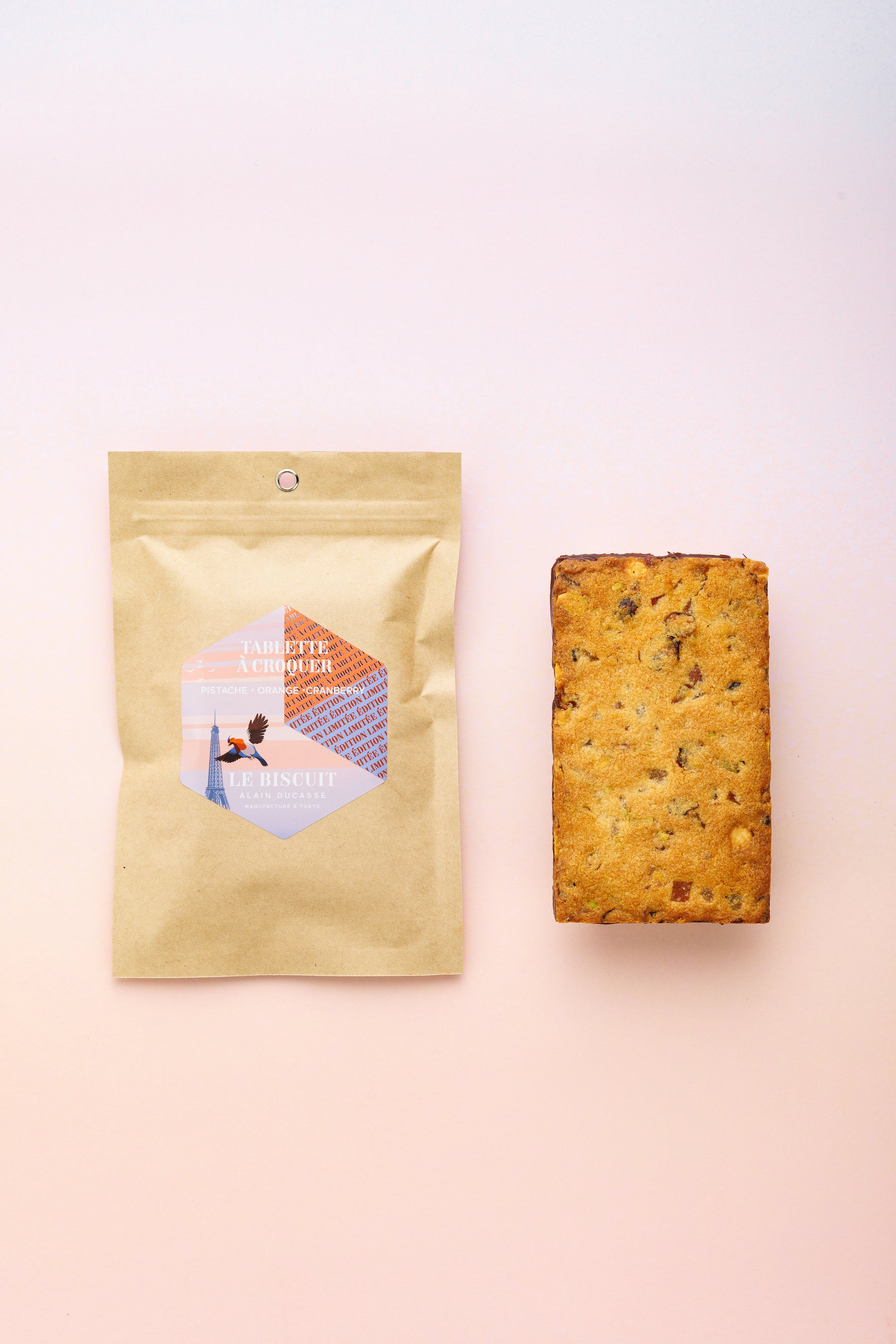 タブレットショコラサイズの大きなビスケット。ジューシーなオレンジやレモンのコンフィやピスタチオ、アーモンドなどが入った生地を焼き上げ、片面をショコラでコーティング。¥2,808